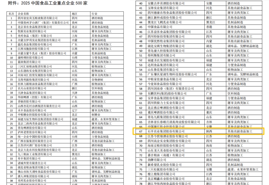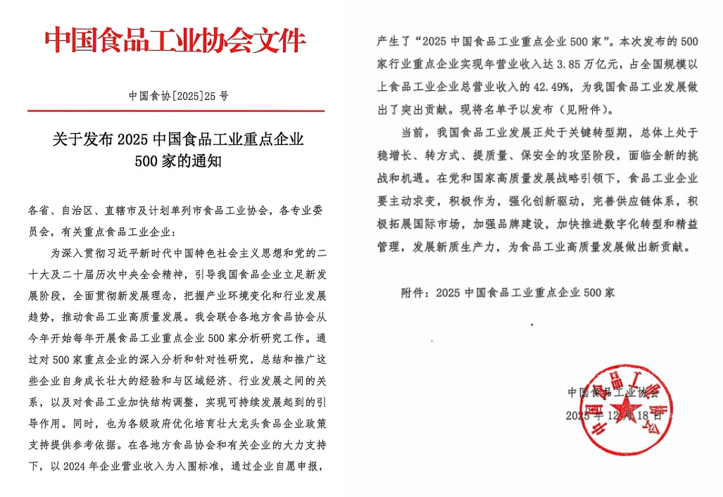 12月25日,“2025全國食品工業(yè)科技進步工作會議暨2025中國食品產業(yè)發(fā)展研究報告發(fā)布會”在京召開,中國食品工業(yè)協(xié)會牽頭組織編寫的《2025中國食品產業(yè)發(fā)展報告》發(fā)布,并同期首度發(fā)布了“2025中國食品工業(yè)重點企業(yè)500家名單”。石羊集團憑借在農業(yè)食品領域的深厚積淀與卓越實力,成功躋身榜單、位列第67名,彰顯了行業(yè)對企業(yè)綜合實力的高度認可!中國食品工業(yè)協(xié)會常務副會長沈箎、中國工程院院士任發(fā)政致辭,副會長兼秘書長馬勇作了《食品工業(yè)生產運行與科技創(chuàng)新發(fā)展報告》,中國食品工業(yè)協(xié)會黨委書記、副會長王琪主持會議。
